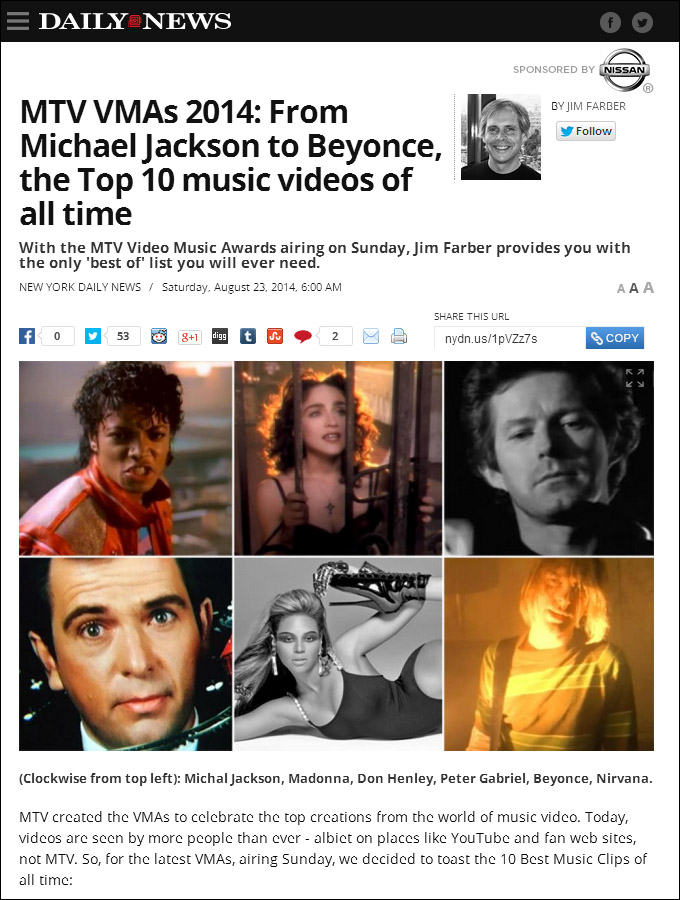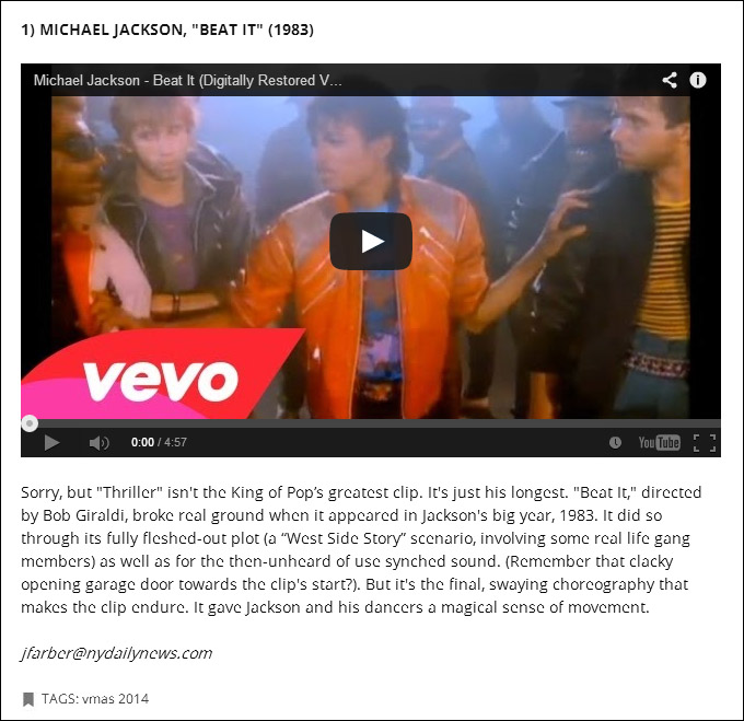 | 1位 2位 3位 4位 5位 6位 7位 8位 9位 10位 | MICHAEL JACKSON MADONNA TALKING HEADS DON HENLEY NIRVANA PETER GABRIEL BEYONCE WHITE STRIPES JOHNNY CASH RED HOT CHILI PEPPERS | "Beat It" "Like A Prayer" "Road To Nowhere" "Boys Of Summer" "Smells Like Teen Spirit "Sledgehammer" "Single Ladies" "Fell In Love With A Girl" "Hurt" "Give It Away" | (1983) (1989) (1985) (1984) (1991) (1986) (2008) (2002) (2002) (1991) |