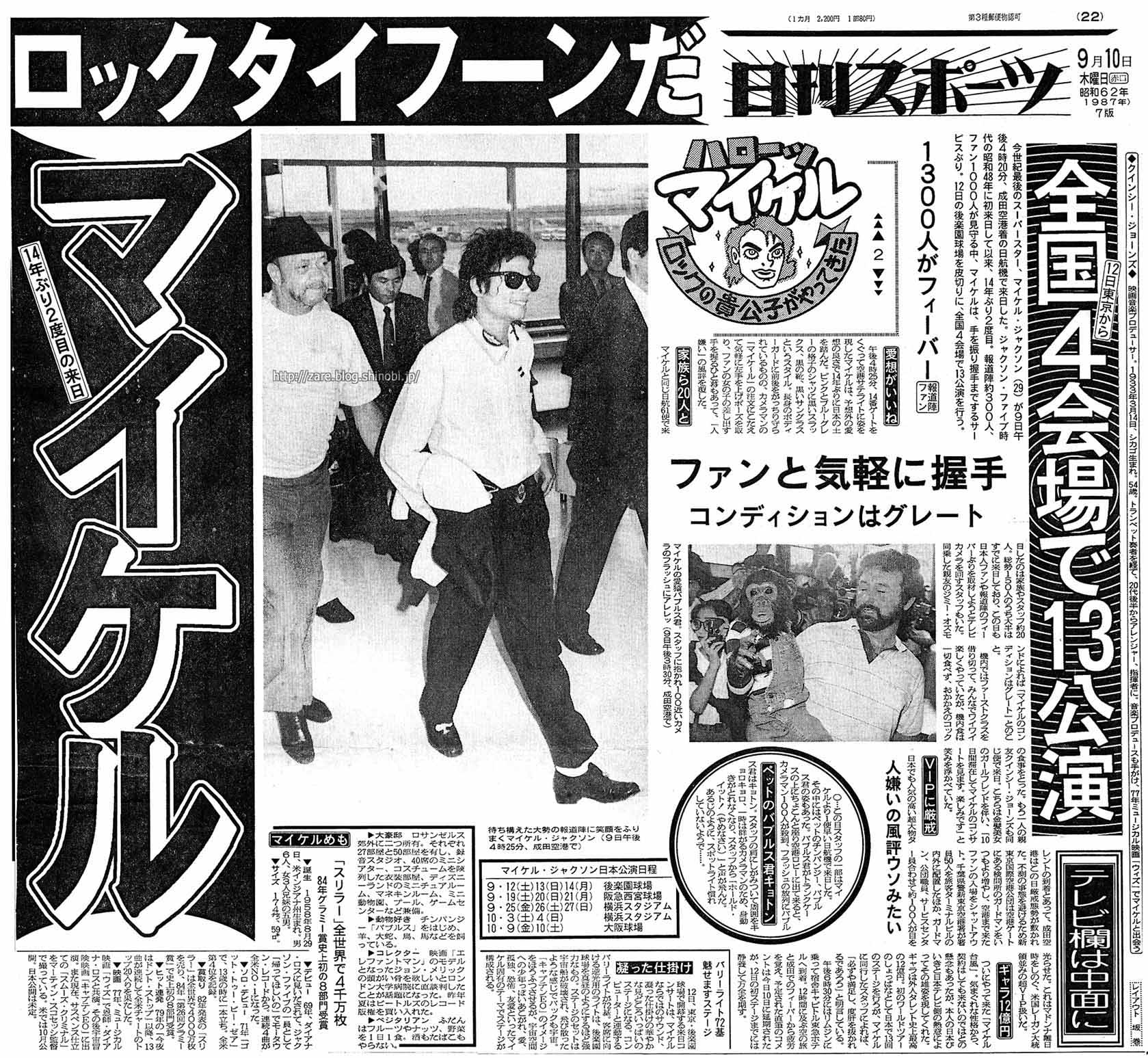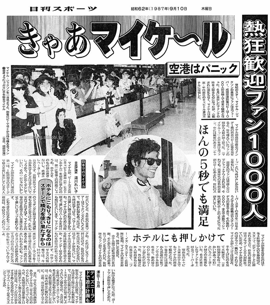| マイケルが、ビートルズと同じキャピトル東急(旧・ヒルトンホテル)を宿舎に選んだのは、第一に警備上の問題でしょうね。 ホテルそのものが広過ぎないし、直通エレベーターが1台きりです。 公演以外でマイケルが外出することは まず無いでしょうから、とにかく安心していたい、その一心じゃないかしら。 マイケルが出歩かない理由の第一は、1時間30分のステージで精力を使い果たしてしまう人だということ。 5年前の全米ツアーはジャクソンズということで、彼が休む間もあったけど、今回は出ずっぱり。バラード以外は激しい踊りが続きますからね。 マイケルはこのために15時間ぶっ通しのリハーサルを何日も続けたといいます。 マドンナのジョギングに相当する体調管理も必要だと思うけど、これも室内でこなすはず。マイケルの場合は2時間ぐらい音楽に合わせて激しいステップを踏むんです。 こもりきりになるもう1つの理由は、やはりファンのパニックね。 これはプレスリーと同じだけど、取材の方も当時とは比べものにならないほどマークがきついし、マイケルは本国でも映画を観る時は映画館を借り切りとか、キャンデー屋さんそのものを邸宅内に作ったりです。 ロサンゼルスの情報では、今回の来日で東京ディズニーランドを1日借り切りたいとの希望もあるとか。 彼の一連の奇行といわれるものも、ファンとマスコミの追跡から逃れてカゴの鳥となったところから始まっているんですよ。 |