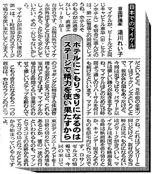 | 【日本でのマイケル】 - ホテルにこもりっきりになるのはステージで精力を使い果たすから - 音楽評論家 湯川れい子 |
