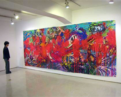 ボクシングのグローブに赤い蛍光塗料をつけ、描いた絵の上にパンチした。