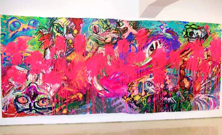 彼の偉大さに気が付き、題材にしたという。周囲にはお化けガエルなどが太い筆遣いとド派手な色で描かれ、