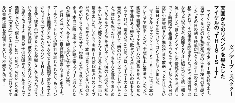 「でも、『マイケル・ジャクソン THIS IS IT』 を見て、彼を否定する人たちが黙りこんじゃった」 のって、オメー自身ちゃうんかと。