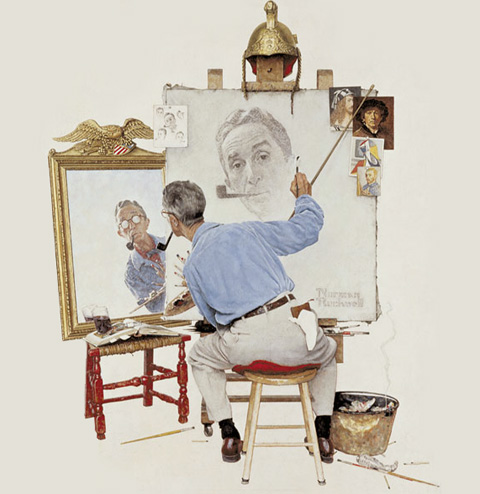 著名なノーマン・ロックウェル画伯の 『Triple Self-Portrait』(1960)をパロったもの。