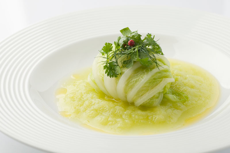 白菜の中に季節折々の旬野菜を包んで蒸す。
