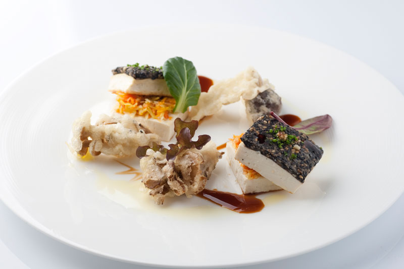 ゴマと豆腐のステーキ きのこのベニエ添え ソイソース