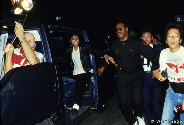 バンのドア全開で手を振りながら西宮球場を出るマイコー 21時すぎ、帰着したホテルでマイケルは