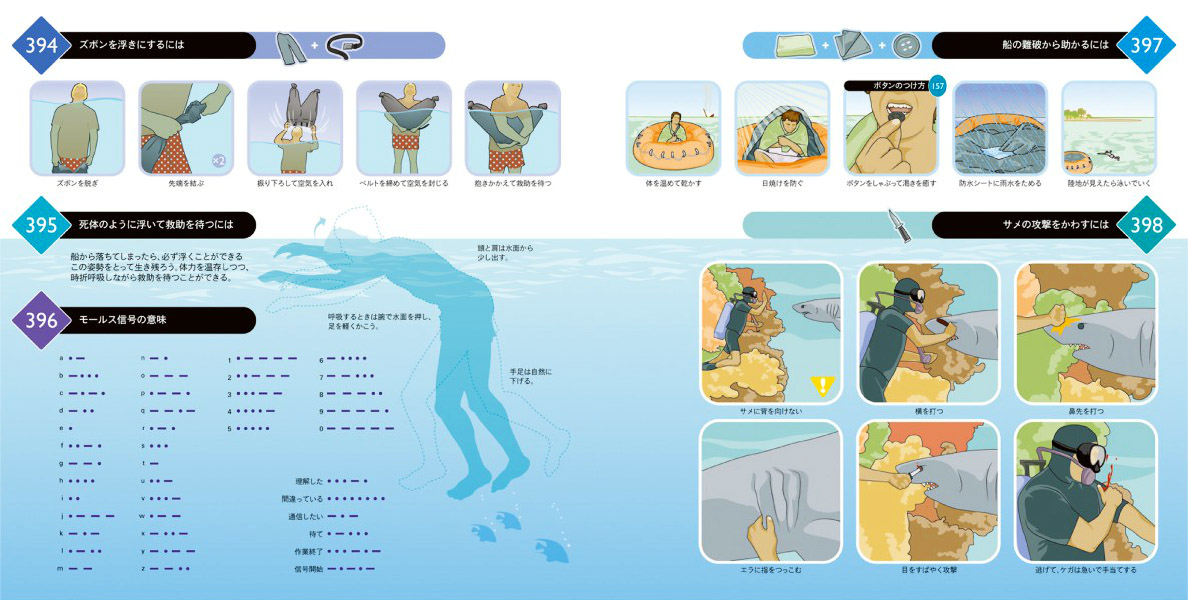 = 海での救助の待ち方,モールス信号の意味,サメのかわし方 =