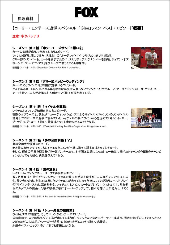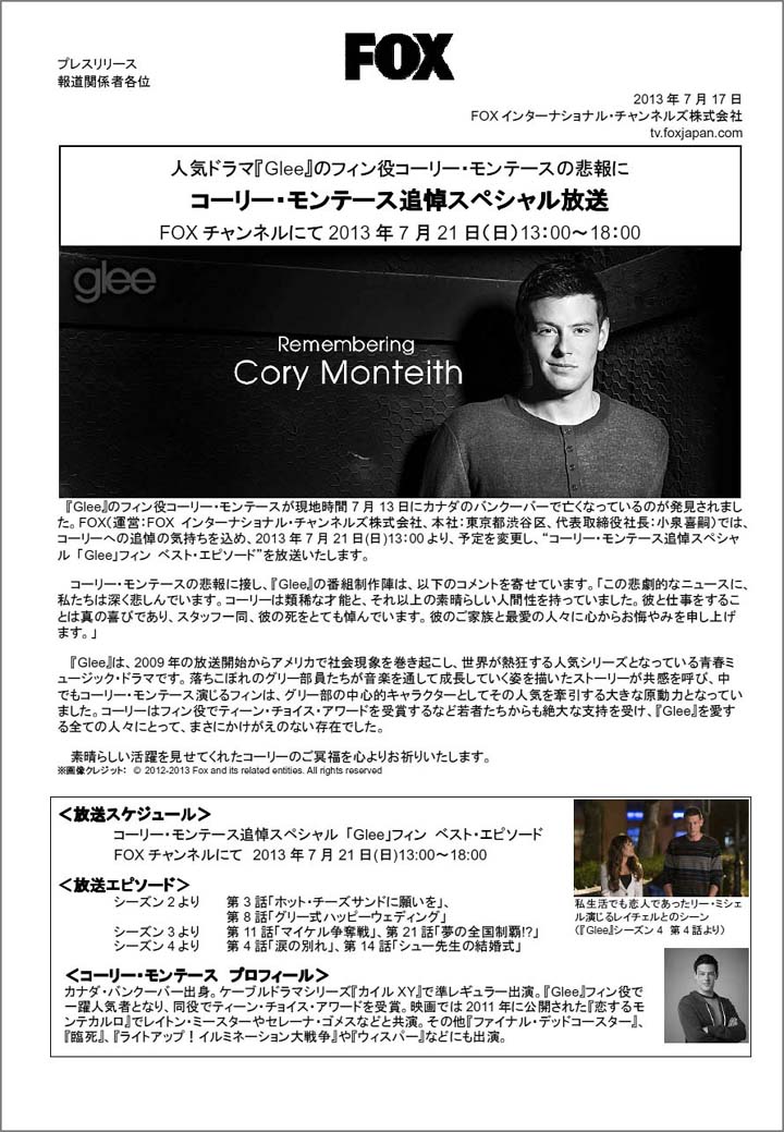 今月13日、主役級のフィン役 コーリー・モンテース氏(31)が急死 (死因:ドラッグ&ヘロイン) したのを受け、