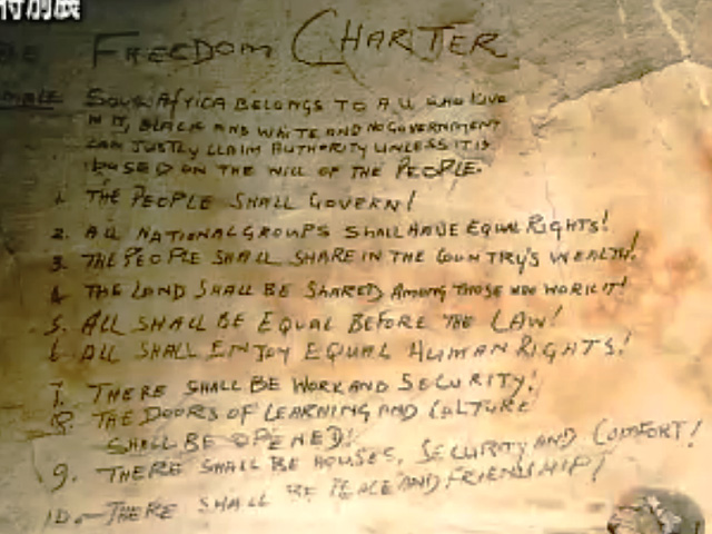 「南アフリカは、黒人・白人を問わず、そこに住むすべての人々に属する」と書いた壁の複製も。