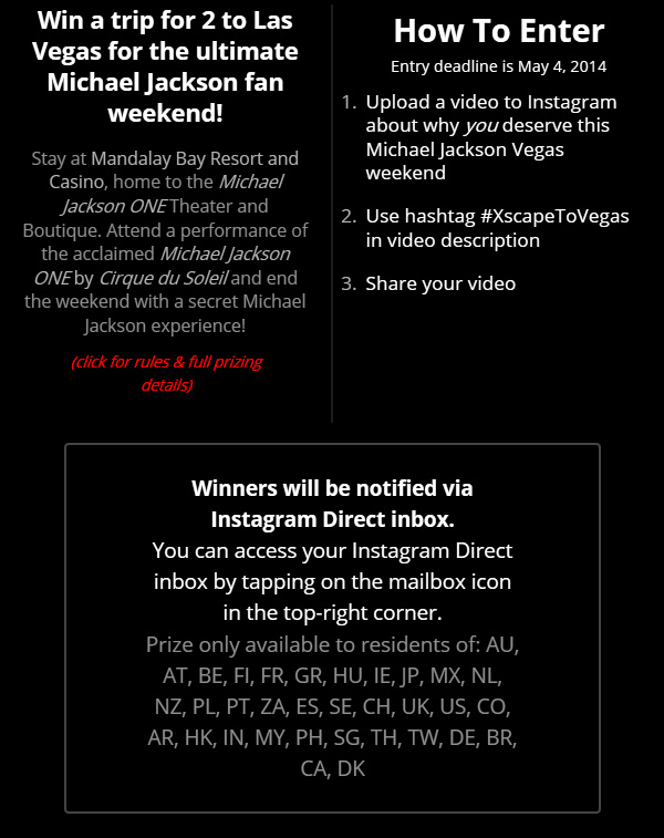 | From the estate of Michael Jackson: The Estate of Michael Jackson and Sony Music are very excited to announce the launch of a contest today providing two lucky winners (and a guest) the opportunity for the ultimate Michael Jackson weekend in Las Vegas. The contest is open to fans in many countries worldwide, but not all. Due to local legal restrictions, residents in certain territories are not eligible to participate in the sweepstakes. However, all fans worldwide are welcome and encouraged to create a video and participate in the contest for fun, even if they are not a resident of a country in which they are eligible to win. Please visit http://vegas.michaeljackson.com for contest details and eligibility. Good luck! MJOnline The Official Online Team of The Michael Jackson Estate™ |