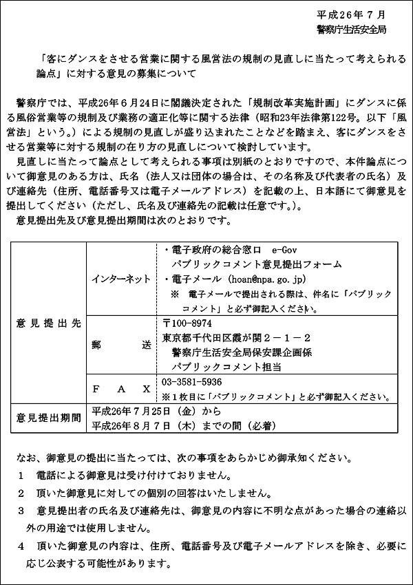 例のダンス営業問題について広く意見を募集しています。(8/7締切)