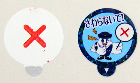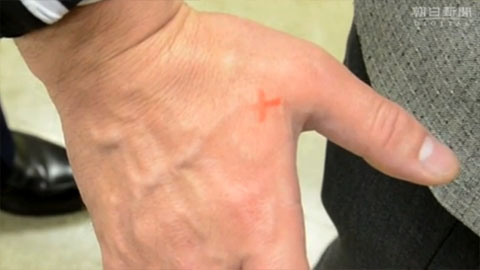 二重構造シールの表面をはがし、油性赤インクのXをチカンの手に押しつける