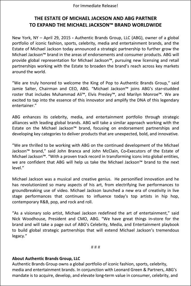 Authentic Brands Group, LLC (ABG) というポートフォリオ所蔵会社との業務提携を