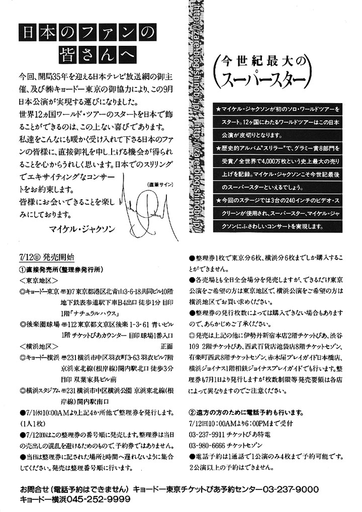 | 最近、恐怖の貸し切り男があちこちに出没している。 貸し切り男は、深海ワカメのような髪のスリムな黒人で、供の者を何十人と引き連れて突如現れる。今までにおもちゃ屋,洋書店など数軒に出没しては貸し切り状態にし、たまたま居合わせた婦女子らを混乱に陥れた。 この分だと、貸し切り男は一般家庭にも侵入し、お茶の間を貸し切る挙に出るのではとの憂慮の声もあがった。 が、彼は子どもの好きそうな所にしか行かないから大丈夫と判明。 事実、貸し切り男は 9月29日、あの東京ディズニーランドに現われたのだった - というわけで、ミッキーマウス君に迎えられ、マイケル・ジャクソン様ご一行のお成りである。時刻は午後8時12分。 ディズニーランドには中核派も赤報隊もいないだろうに、閉園後、ゴミ箱までひっくり返して不審人物が残っていないかチェック,完璧な貸し切り状態にするため、入場予定が40分も遅れた。 もともとディズニー大好き人間のマイケル様。 まず、「ミート・ザ・ワールド」を観、「スペース・マウンテン」に2回乗り、自分が出ている映画「キャプテンEO」を観て、「スター・ジェット」 「ビッグ・サンダー・マウンテン」 「ピーターパン空の旅」 「カリブの海賊」と、午後11時まで、ひと通りのアトラクションを楽しまれたのであった。 もちろん、貸し切り料はタダである。 飲み屋のお座敷の貸し切りさえままならぬ我々には、とても信じられないこのご威光。 日本には、どうかウチにもおいでなまし、と身をよじらせてコビを売る所があまたあるから、マイケル様も よりどりみどりでありましょう。 それにしても、ツアーの疲れも溜まっているでしょうに、ここで3時間も遊ぶなんて、童心に帰ると言うよりも、29歳にして子どもの現役をやっていると言うべきか。 たとえば、フランク・シナトラ様などにこんなご威光を与えたなら、「皇居を貸し切りにしろ」なんて言い出すかもしれないし、アラン・ドロン様なら、「吉原ソープ全店貸し切り!」をご所望になるかもしれない。 千昌夫様なら、銀座を貸し切りにして全部地上げしちゃうかもしれないし、そういえばあのジョギング好きのマドンナ様が、よくも 「外堀通りを貸し切りにしなさい」と言わなかったものだ。 その種のことを考えると、マイケル様は、ご威光のわりに謙虚な方だろうか。 しかし、9月分の公演だけで30万2,000人を動員し、アルバム『BAD』もすでに60万枚以上売れているというこの国で、マイケル様は、あのペットのチンパンジーにまで稼がせる。 乳業会社の広告に出すのだそうだ。 せっかく貸し切り状態のこの国だから、やはりご威光は無駄なく活用しようということなのか。 |