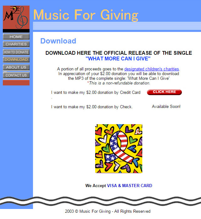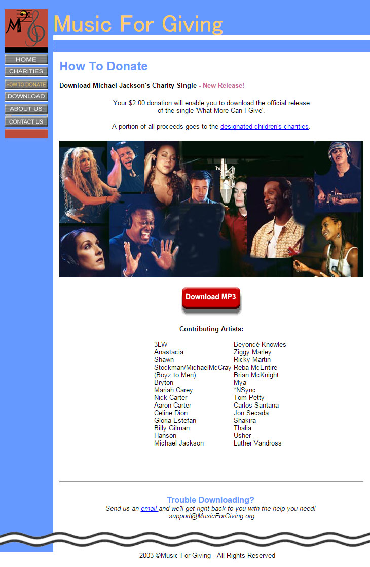 | 1) This is Michael Jackson. I would like to thank you for listening and supporting WMCIG. 2) Hi, this is Michael Jackson. Keep listening to hear What More Can I Give? 3) Hi, this is Michael Jackson. Please go to WMCIG.com and download now to help Childrens Charities and on behalf of all the artists part of this project I would like to thank you for your support. 4) Hi, this is Michael Jackson. Please go to WMCIG.com and download now to help Childrens Charities and on behalf of all the artists part of this project I would like to thank you for your support and all your love. Thank you very much... 5) This is Michael Jackson, and on behalf of all artists for WMCIG. We would like to wish you a joyious Holiday season... 6) Hi, this is Michael Jackson, and on behalf of all artists for WMCIG. We would like to wish you a joyious Holiday season... 7) Hi, this is Michael Jackson. We can make the world a better place thank you for supporting WMCIG. 8) This is Michael Jackson. Keep listening for details how to join me for a celabration for WMCIG. 9) This is Michael Jackson. Keep listening for WMCIG and details of worlds childrens day! 10) This is Michael Jackson. Keep listening for WMCIG and details of the world childrens day |