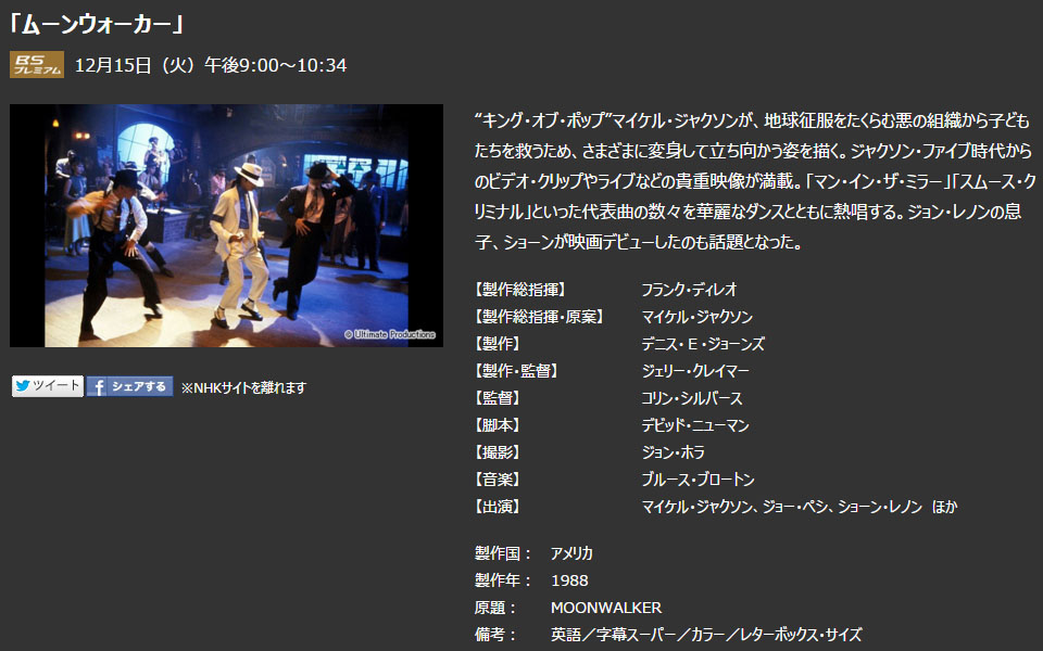 【プレミアムシネマ 『ムーンウォーカー』】(米1988年) ▼マイケルが地球征服を企む組織から子供らを救うべく立ち向かう姿を描く