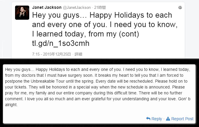 | みんな、メリー・クリスマス。 みんなにお知らせしなければいけないことがあるの。 お医者様から今日告げられたことなんだけど、私はすぐに手術をしなければいけないって。 アンブレイカブル・ワールド・ツアーの春までの公演を延期しなければいけないなんて、みんなに伝えるのは心が痛い。でも、予定していた公演はすべて、日程を再調整するわ。チケットは大切に保管しておいてね。新しい日程が決まるまで、チケットと一緒に楽しみにしておいて。 どうか、この困難に直面している私や家族、それから事務所のことを祈ってほしいわ。 この件について、今後はもうコメントをしない。 みんな大好きよ。みんながくれた愛、そして理解に心から感謝してるわ。きっと大丈夫よ |