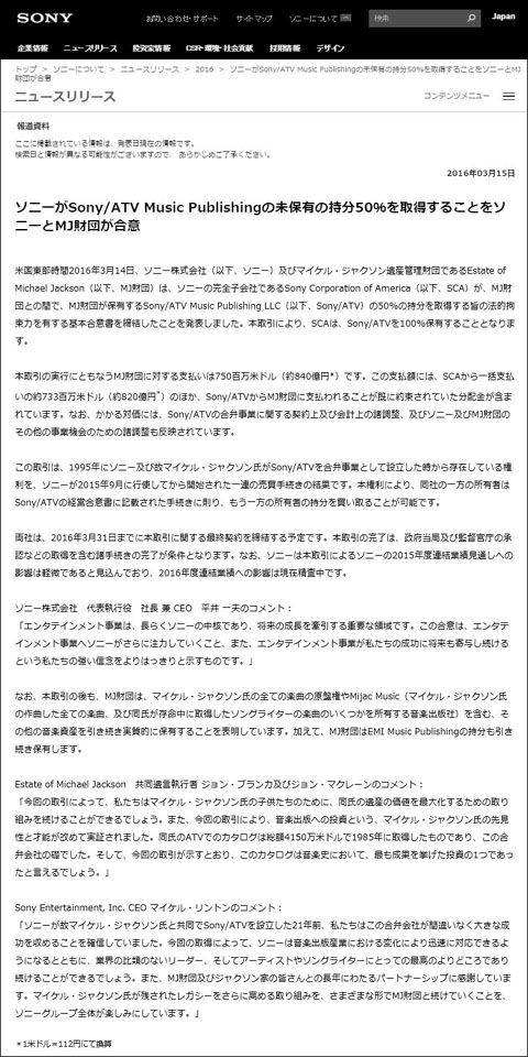 「ソニーが故マイケル・ジャクソン氏と共同でSony/ATVを設立した21年前、私たちはこの合弁会社が間違いなく大きな成功を収めることを確信していました。