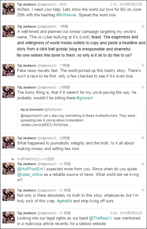 = MJエステート = 7年前の今週土曜(6/25)に、世界中で困っている子供たちを助けることに身を捧げた人道主義者の素晴らしいアーティストがこの世を去りました。 遺言執行人を含め マイケル・ジャクソンのファン達は、くだらないタブロイド記事で再び彼の信用に泥が塗られる事よりも、彼が遺した素晴らしい贈り物を思い返す事のほうを好みます。 サンタバーバラ郡が称する "インターネットもしくは特定不明の情報源から取得したと思われるもの" を含め、これらの報告書にあるものは全て偽造であり、確実にマイケルの命日のタイミングを狙ったものです。 インターネットのクリック報酬を介してマイケルから搾取し続ける低俗な恥知らずは、2005年に失敗した魔女狩りで14の猥雑なチャージの1つ1つが陪審団によって無罪とされた事実を無視するのです。(※この一文は日本版に無かったのでわしの和訳。ミスご容赦) マイケルは、生きている間も亡くなった今も、無実であることに変わりはありません。 もうたくさんです。 |