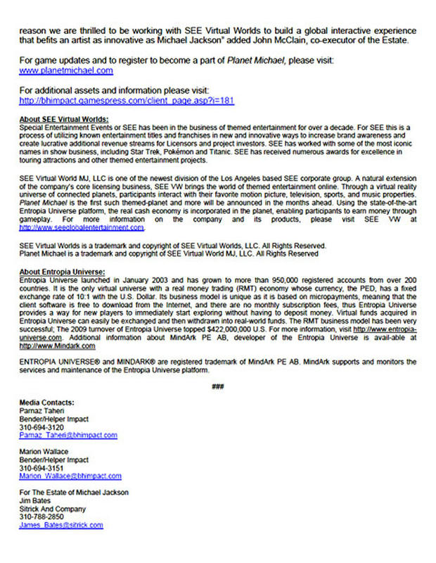 MJ財団が、LAのゲーム会社 SEE Virtual Worlds社と 2011年の展開を目指した