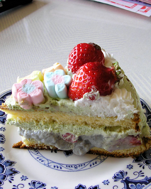 抹茶クリーム&黒ごまプリンクリーム。 上のお花はマシュマロ