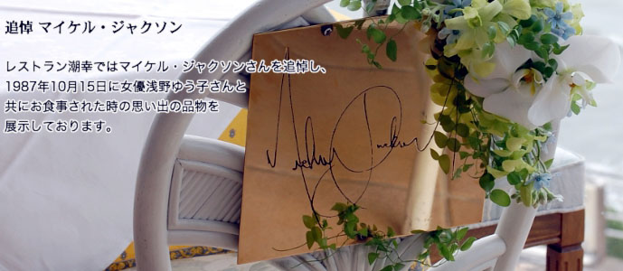 Michael Jackson JAPAN TOUR 87初のソロコンサートで来日していた87年、マイケルさんは菜食主義でご自身のお抱え女性料理人がおりましたが急遽帰国してしまい、また体調をくずされていて代わりのシェフを探していた所、弊社系列店の料理人がマイケルさんの宿泊先である当時の元キャピトル東京に招かれ食事のメニューを考えて提供しました。