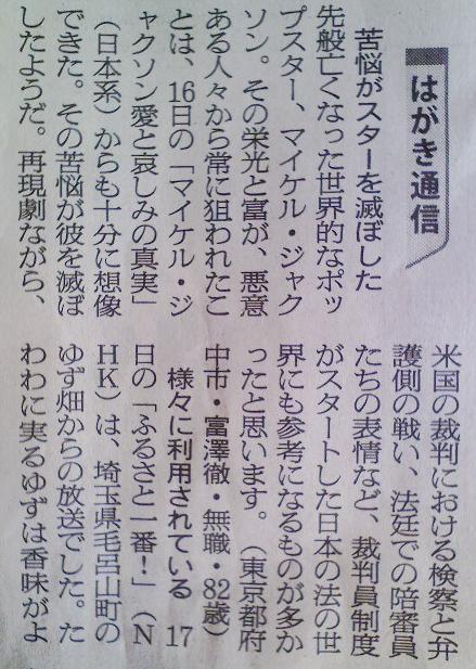 ウィークデーの朝刊に2通載る、TVの感想・意見欄