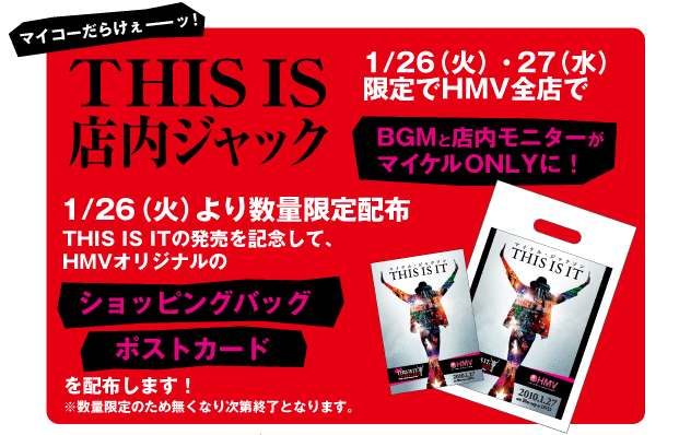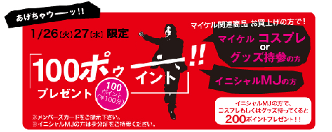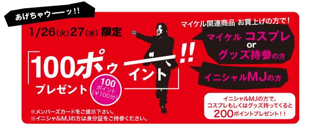 MJ関連商品購入時、MJコスプレの方・MJグッズ持参の方・イニシャルMJの方