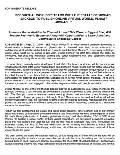 MJ財団が、LAのゲーム会社 SEE Virtual Worlds社と 2011年の展開を目指した