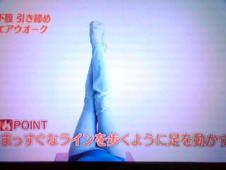 2.足を真上にあげ、ひざをクロスさせる。(ひざは曲げない)