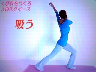 2.息を吸いながら上半身と両手を左ナナメ上へねじる。