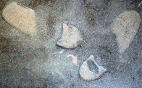 【The Broken Heart Stone = 傷ついた心の石】と名づけられたセメント製の石板(約76cm四方・約170kg) が