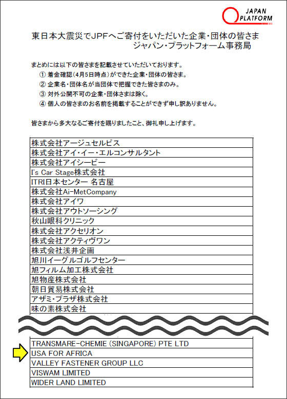 私たちは日本の救援活動を支援するため、“ジャパン・プラットフォーム・オーガニゼーション”に対し、$10,000を寄付する事を承認しました。
