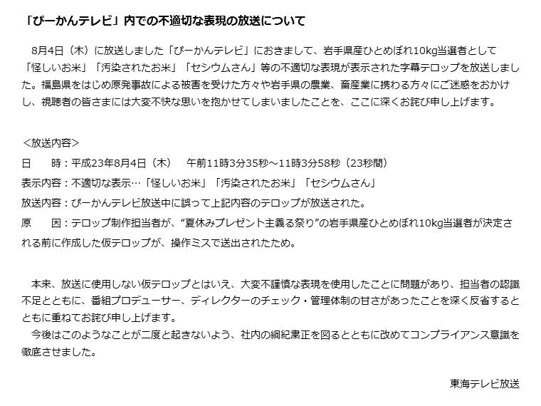 「リハ用の仮テロップが操作ミスで送出された」 っつーけど、問題はそこではなく。