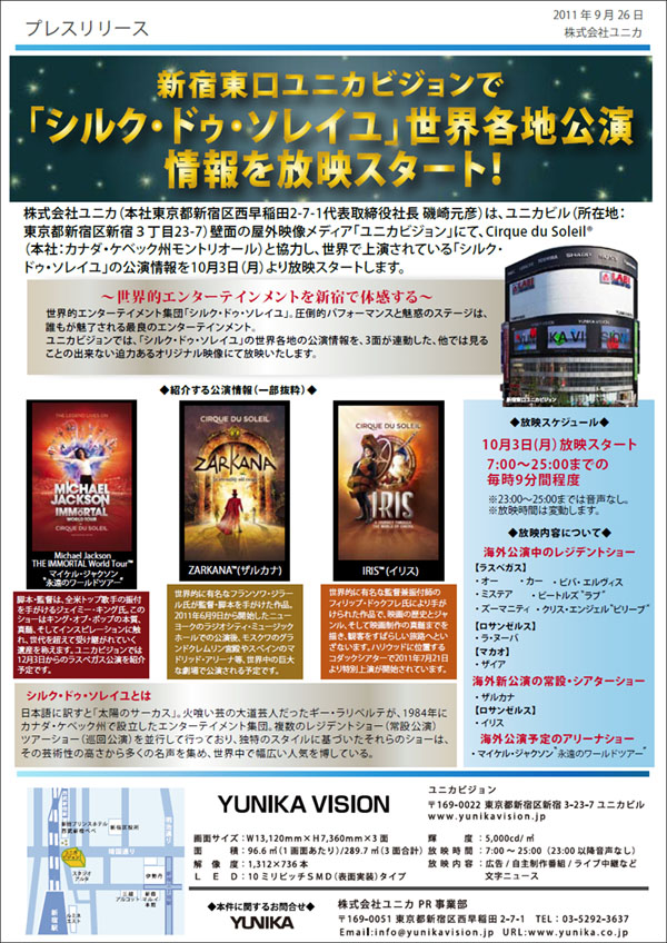 ユニカビジョンでシルク・ドゥ・ソレイユの各公演情報がまもなくOA開始、