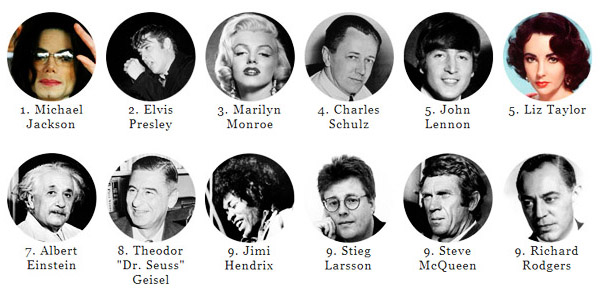 10/25付で米経済誌Forbes(電子版)が発表した、故セレブの最近1年間の長者番付で