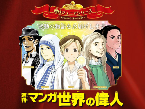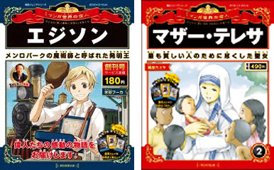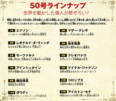 世界を動かした偉人50人を、毎号1人ずつオールカラーで描く子供向けの週刊誌。