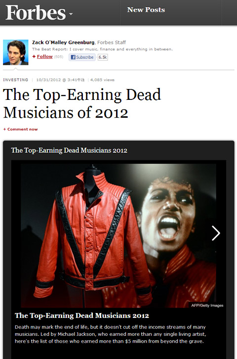 【Top-Earning DEAD MUSICIANS 2012】1位 $145M - Michael Jackson2位 $ 55M - Elvis Presley3位 $ 17M - Bob Marley4位 $ 12M - John Lennon5位 $ 6M - Richard Rogers6位 $ 5M - George Harrison