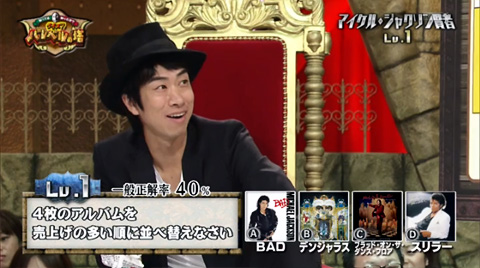 『BAD,DANGEROUS,BLOOD ON THE DANCE FLOOR,THRILLER の4枚のアルバムを、売上げの多い順に並べ替えなさい』 (一般正解率40%)