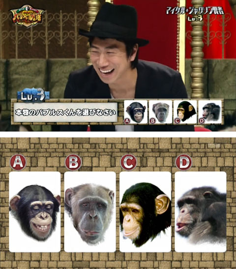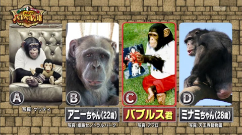 『A~Dのチンパンジーの写真の中から本物のバブルスくんを選びなさい』