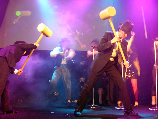 4本マイクに女性コーラス隊、そして木づちを持った男たち?