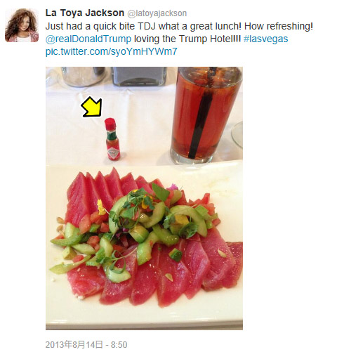 8:50、ラトーヤ姐がツイ。マグロの刺身にタバスコかけるのォ