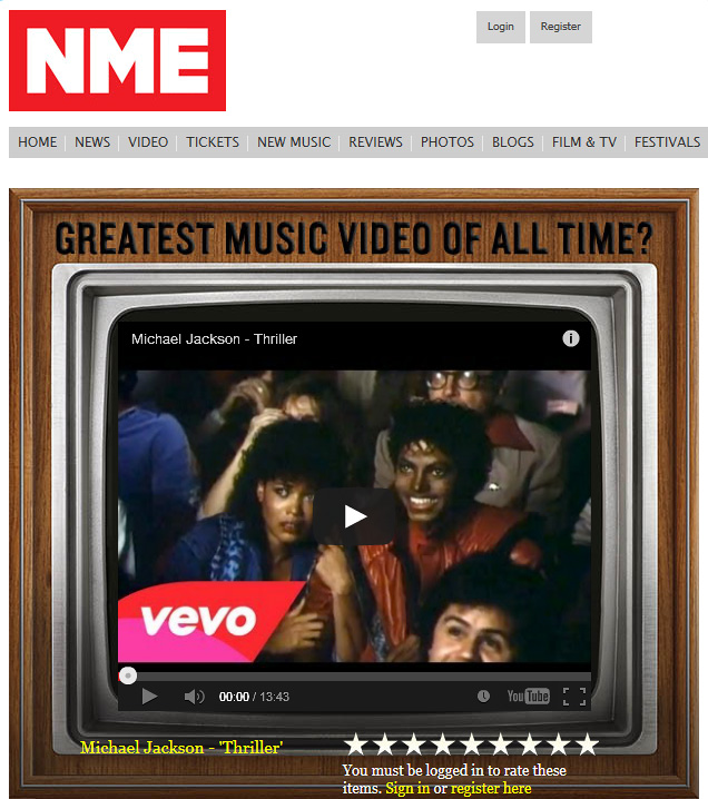 Michael Jackson - 'Thriller'http://www.nme.com/ratemy/325791/whats-the-greatest-music-video-of-all-time/item/325811PR