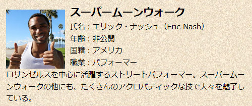 アメリカのストリートパフォーマー、エリック・ナッシュ氏の "Super Moonwalking"。