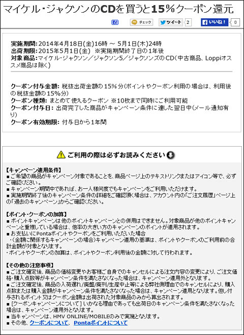 マイケル・ジャクソンのCDを買うと15%クーポン還元!