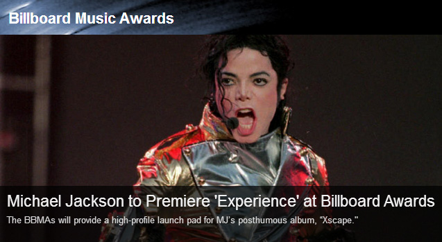 | Michael Jackson is music's greatest innovator and among the most beloved performers and influential artists of all-time. In this spirit, the Estate of Michael Jackson has created a Michael Jackson world premier experience, live at the 2014 Billboard Music Awards, on ABC May 18. This is television history ! Michael Jackson like you've never seen him before – you do not want to miss it ! |