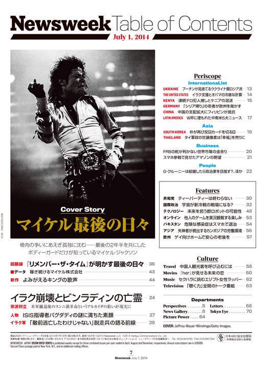 【Newsweek ニューズウィーク日本版】 2014年 7・1号 460円 Cover Story マイケル最後の日々 ▼P.36 回顧録 『リメンバー・ザ・タイム』が明かす最後の日々 いま明かされるマイケル最後の日々-ボディガードだけが知る真実の姿とは