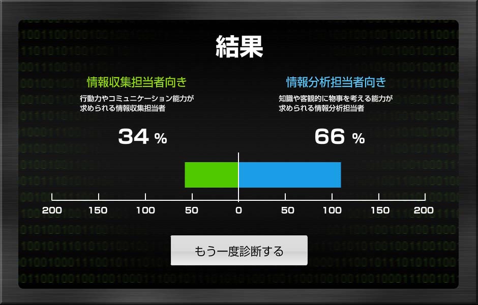 Mission 1: Aptitude Challenge (アプティテュード・チャレンジ)情報収集担当者または情報分析担当者 どちらに向いているのか,チェックできるゲーム。
