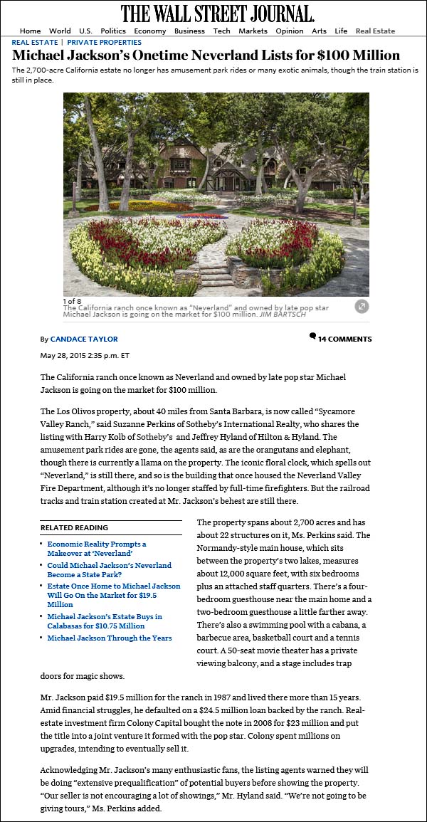 1億ドル(約123億円)でネバーランドが売りに出されると報じのの。