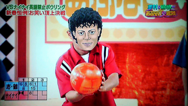 マイケルのお面をつけてボーリングする岡村氏 @2年前の正月番組